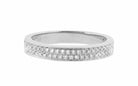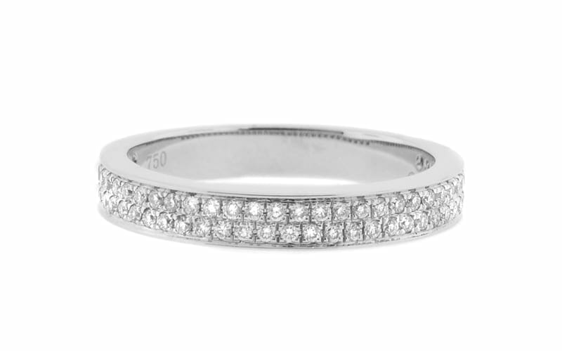 18kt white gold band features 66 round brilliant diamonds with pave set to maximize their sparkle. This ring is currently a finger size 6.5.