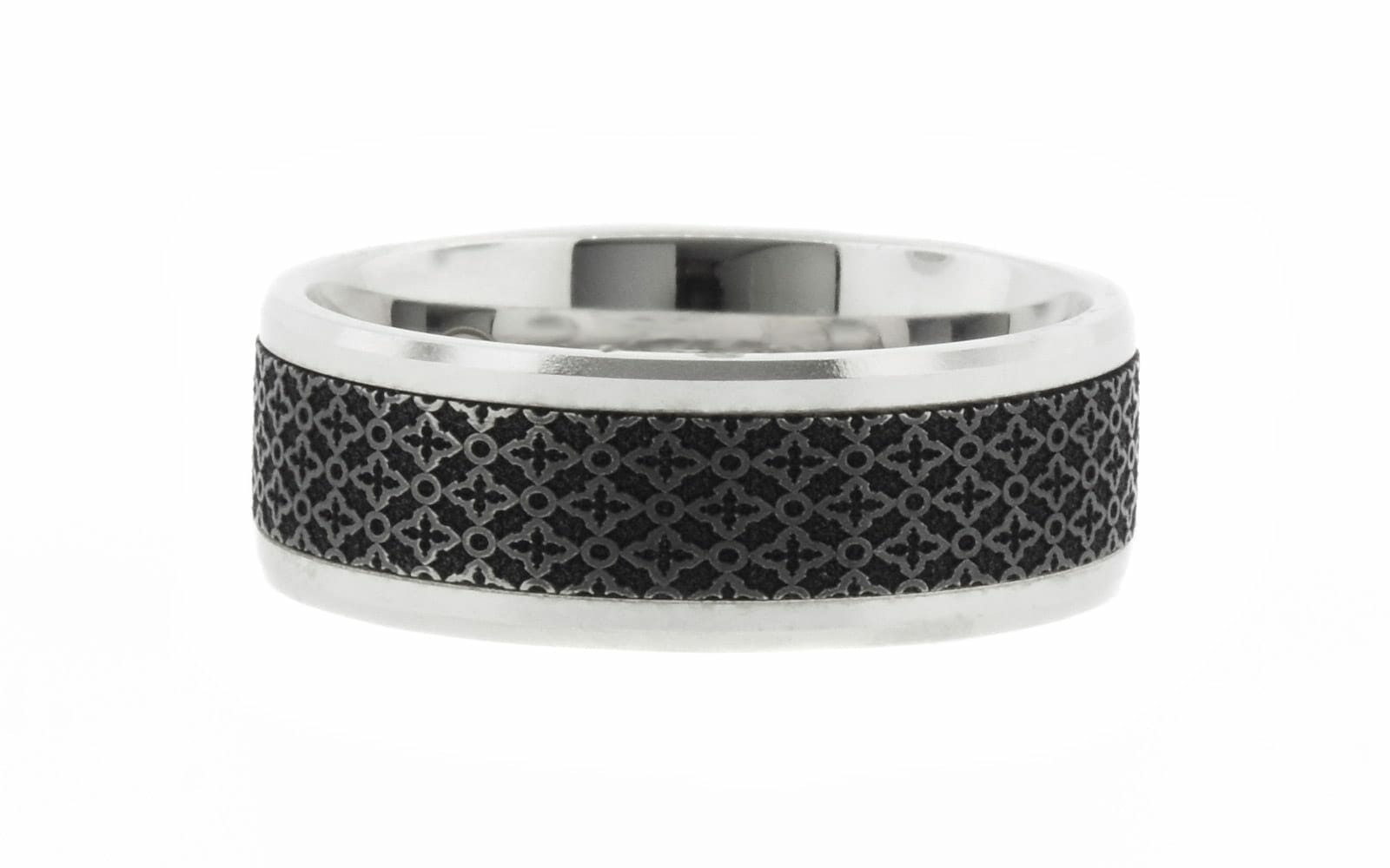 This 14kt white gold and black titanium band features a unique ottoman motif pattern.