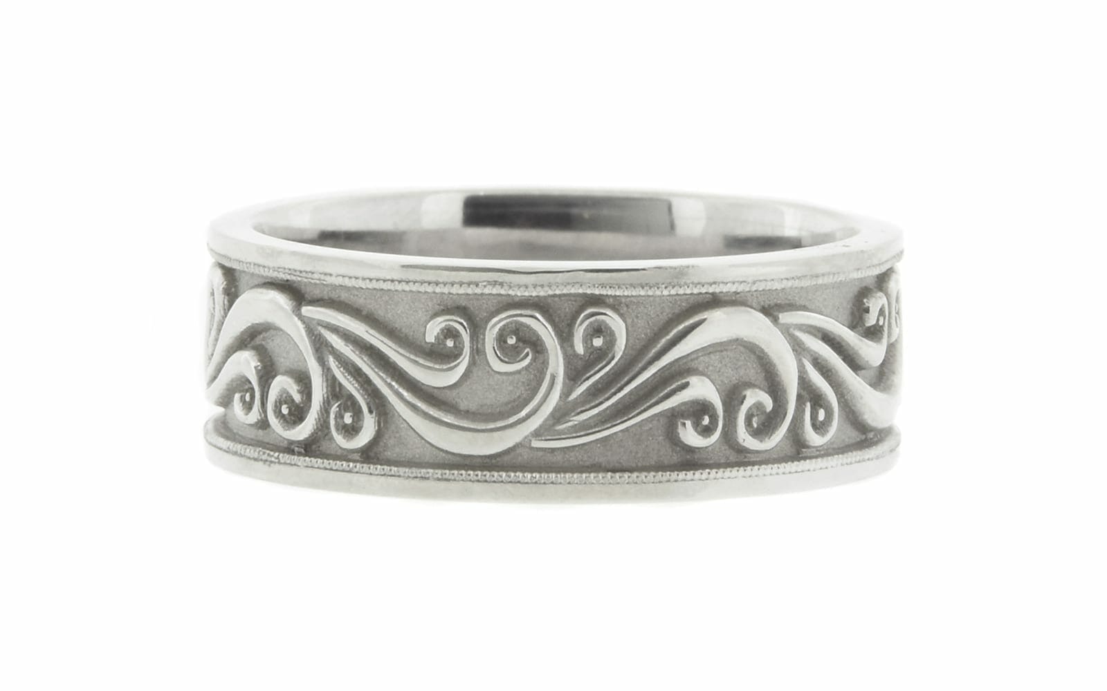 This 18kt white gold band features a filigree design accented with a milgrained, and sandblasted finish.