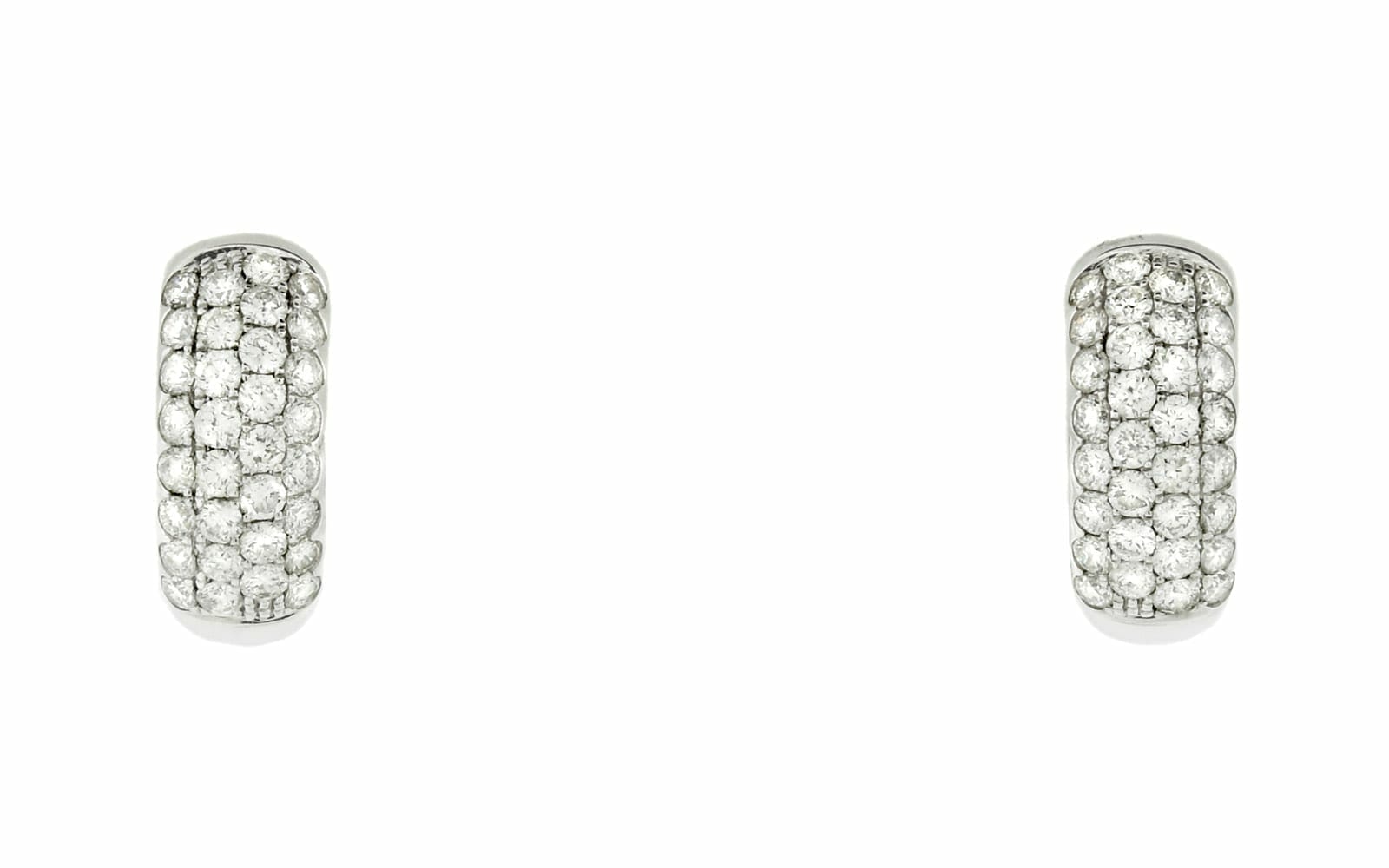 These luxurious 14kt white gold hoop earrings are set with 64 round brilliant cut diamonds. The total carat weight is 1.12ctw, E-F colour and VS clarity.